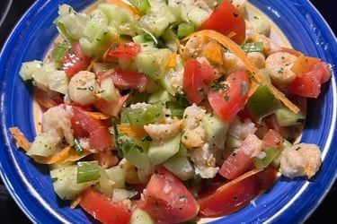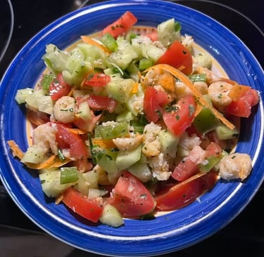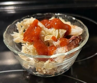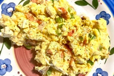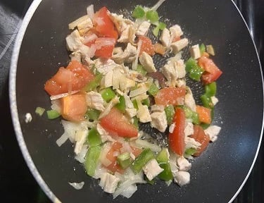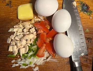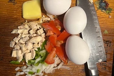 Leftover Chicken, Tomato, Bell Pepper, Onion. OR, you can cook it up and add some Eggs.